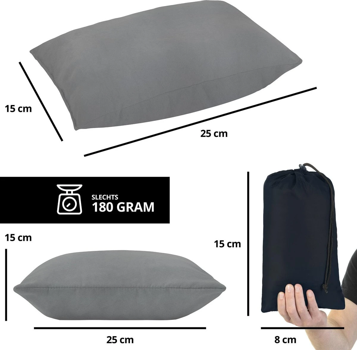 Een gecombineerde set slaapzak + kussen van Dutch Mountains. Zachte comfortabele materialen, gemakkelijk te wassen, uitstekende vochtregulatie en compact. Het kussen is zacht, extreem lichtgewicht (180gr), gemakkelijk te wassen en op te bergen tot een compact meeneemformaat van slechts 15 x 8cm. De speciale elastische holle vezel in het kussen zorgt voor een zachte balans tussen hoofd en ondergrond en voelt alsof men in een wolk duikt. Het kussen biedt een goede ondersteuning, maar is toch zacht. Het kussen voelt aan als een zachte perzikhuid en is geschikt voor alle seizoenen. Door het compacte formaat van 15 x 15 x 25cm is het kussen niet alleen te gebruiken voor op de camping, maar ook in de auto, de trein, boot, of het vliegtuig. Het kussen biedt voldoende tegendruk, ook bij veelvuldig gebruik. Bovendien heeft het kussen de eigenschap dat het ademt en goed ventileert en kent een uitstekende vochtregulatie.