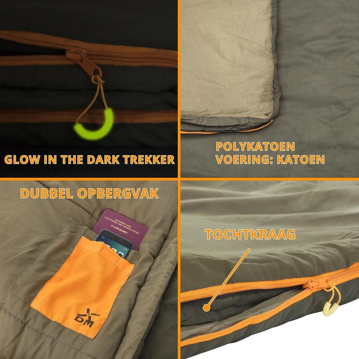 Ook de ‘Vlieland’ is door Dutch Mountains van allerlei slimme nuttigheden voorzien. Berg je paspoort of telefoon veilig op in de twee klittenbandvakken in de slaapzak. En wat dacht je van glow in the dark zippers? Nooit meer op zoek naar je zipper in het donker en bovendien blijft je rits dicht als je draait in je slaap omdat de zippers zijn uitgerust met zip-stop. Rits trouwens ook gerust twee ‘Vlieland’s’ aan elkaar. De ritsen zijn er klaar voor!
