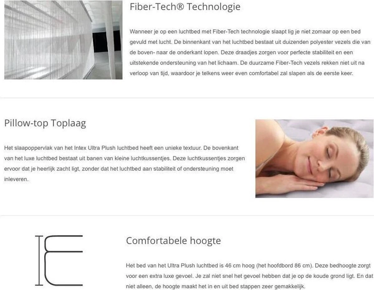 Het luchtbed is voorzien van een Fiber-Tech technologie die je gasten betere ondersteuning en stevigheid biedt. Het ingebouwde hoofdeinde biedt rugondersteuning bij het loungen en tv kijken en voorkomt dat kussens tijdens het slapen op de vloer vallen. De krachtige ingebouwde pomp zorgt voor probleemloos opblazen en leeglopen. De dubbellaagse, comfortabele bovenlaag zorgt voor een zacht gevoel dat het comfort maximaliseert. Bovendien is dit luchtbed ook extra hoog, ideaal voor ouderen of voor mensen met rugklachten. Om je Ultra Plush Headboard luchtbed te beschermen, raden wij je aan een hoeslaken te gebruiken zodat de toplaag schoon blijft.