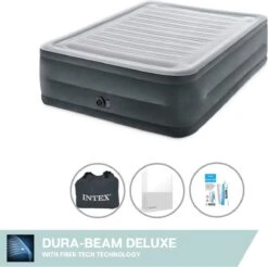 Het 2-persoons Intex Comfort-Plush High Rise ‘Queen’ luchtbed met afmeting 152x203x56 cm is geschikt voor thuisgebruik. Het luchtbed heeft een hoogte van 56 cm, waardoor in- en uitstappen extra gemakkelijk wordt. De binnenkant van het luchtbed bevat polyester draadjes die van de boven- naar de onderkant van het luchtbed lopen. Deze duizenden vezels zorgen voor perfecte stabiliteit en een uitstekende ondersteuning van het lichaam. Deze binnenstructuur met ondersteunde Dura-Beam vezels, ook wel de Fiber-Tech technologie genoemd, is een uniek kenmerk van deze Intex luchtbedden en een garantie voor een comfortabele slaapervaring. Dit unieke luchtbed beschikt naast het fiber-tech interieur ook over een unieke K-beam randondersteuningsconstructie wat ongeëvenaarde ondersteuning en comfort biedt. Daarbij bevat het luchtbed een Quickfill Plus interne pomp, waardoor u enkel de stekker in het stopcontact hoeft te steken en de knop naar ‘+’ hoeft te draaien om het luchtbed op te blazen. Om het luchtbed na het gebruik weer leeg te laten lopen, draait u de knop naar ‘-‘ en het luchtbed zal leeglopen. Het luchtbed beschikt over een zacht dubbellaagse comforttop wat zorgt voor een glad slaapoppervlak en zorgt voor een goede nachtrust. In tegenstelling tot de andere luchtbedden, beschikken de luchtbedden uit de Dura-Beam Deluxe serie over horizontale beams voor het ultieme comfort. Zo creëer je in enkele minuten een fijne slaapplek op de camping, op je logeeradres of voor gasten die blijven slapen.