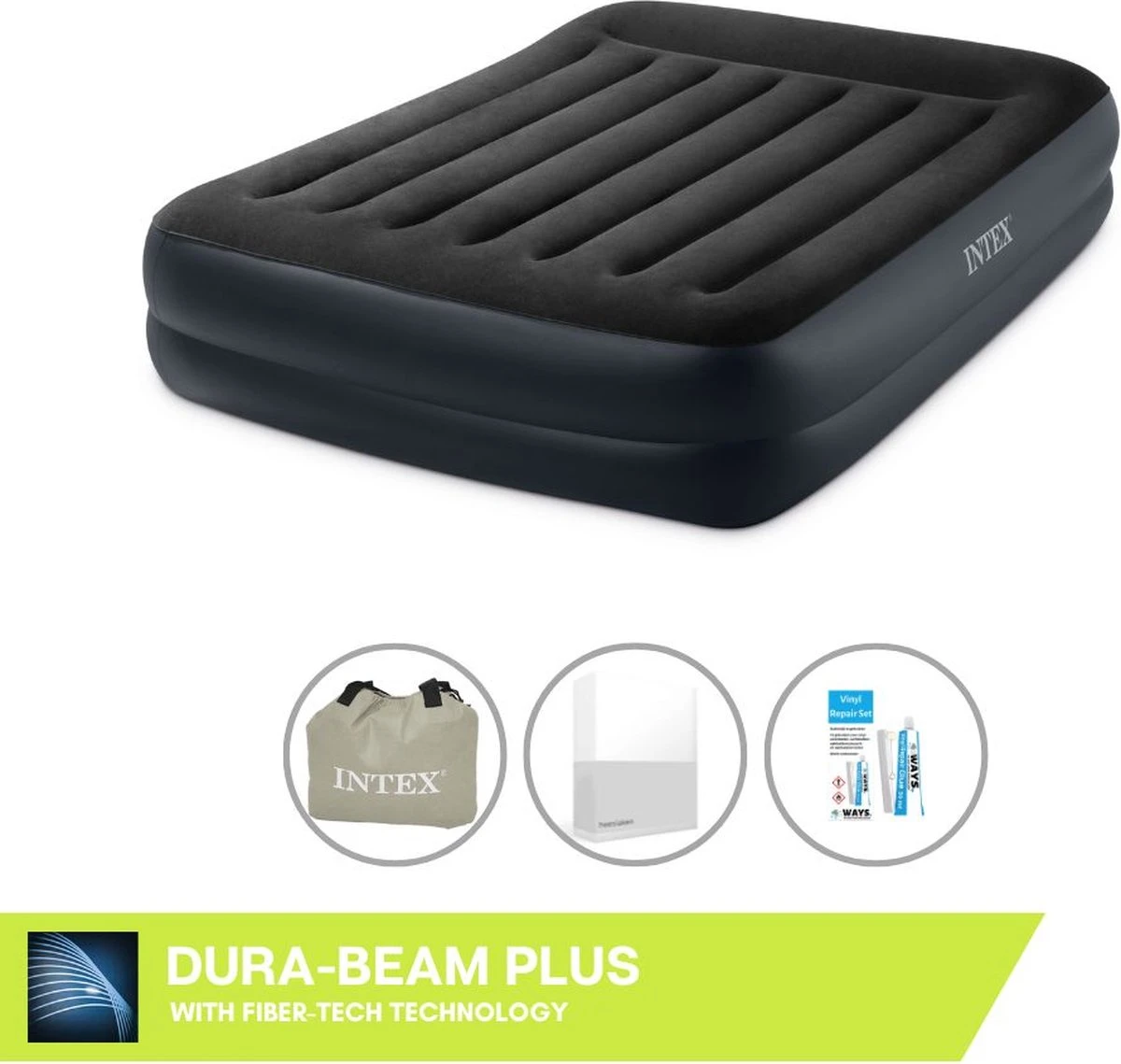 Het 2-persoons Intex Pillow Rest Raised Bed Queen luchtbed met afmeting 152x203x47 cm is geschikt voor thuisgebruik. Het luchtbed heeft een hoogte van 42 cm, waardoor in- en uitstappen extra gemakkelijk wordt. De binnenkant van het luchtbed bevat polyester draadjes die van de boven- naar de onderkant van het luchtbed lopen. Deze duizenden vezels zorgen voor perfecte stabiliteit en een uitstekende ondersteuning van het lichaam. Deze binnenstructuur met ondersteunde Dura-Beam vezels, ook wel de Fiber-Tech technologie genoemd, is een uniek kenmerk van deze Intex luchtbedden en een garantie voor een comfortabele slaapervaring. Het luchtbed beschikt over een Quickfill Plus interne pomp, waardoor u enkel de stekker in het stopcontact hoeft te steken en de knop naar ‘+’ hoeft te draaien om het luchtbed op te blazen. Om het luchtbed na het gebruik weer leeg te laten lopen, draait u de knop naar ‘-‘ en het luchtbed zal leeglopen. Het luchtbed is gemakkelijk op te vouwen en dankzij het fluweelachtige slaapoppervlak lig je heerlijk zacht. Voor extra comfort beschikt dit luchtbed over een ingebouwd kussen. Zo creëer je in enkele minuten een fijne slaapplek op de camping, op je logeeradres of voor gasten die blijven slapen.
