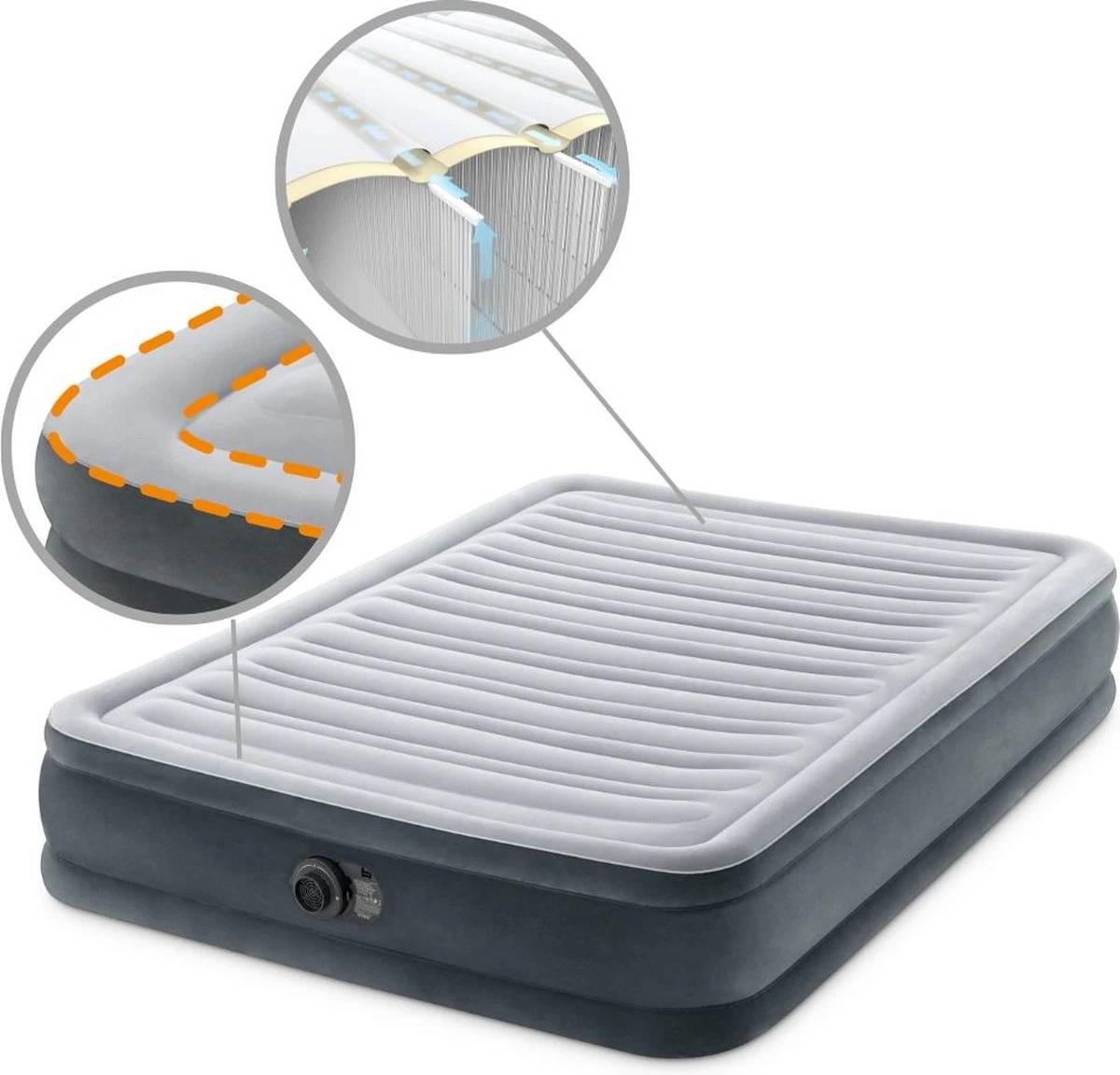 Het twijfelaar Intex Comfort-Plush ‘Full’ luchtbed met afmeting 137x191x33 cm is geschikt voor thuis en op reis. De binnenkant van het luchtbed bevat polyester draadjes die van de boven- naar de onderkant van het luchtbed lopen. Deze duizenden vezels zorgen voor perfecte stabiliteit en een uitstekende ondersteuning van het lichaam. Deze binnenstructuur met ondersteunde Dura-Beam vezels, ook wel de Fiber-Tech technologie genoemd, is een uniek kenmerk van deze Intex luchtbedden en een garantie voor een comfortabele slaapervaring. Het luchtbed beschikt over een unieke rand- en bodemringconstructie wat zorgt voor superieure stabiliteit. Daarbij bevat het luchtbed een Quickfill Plus interne pomp, waardoor u enkel de stekker in het stopcontact hoeft te steken en de knop naar ‘+’ hoeft te draaien om het luchtbed op te blazen. Om het luchtbed na het gebruik weer leeg te laten lopen, draait u de knop naar ‘-‘ en het luchtbed zal leeglopen. Het luchtbed beschikt over een zacht dubbellaagse comforttop wat zorgt voor een glad slaapoppervlak en zorgt voor een goede nachtrust. In tegenstelling tot de andere luchtbedden, beschikken de luchtbedden uit de Dura-Beam Deluxe serie over horizontale beams voor het ultieme comfort. Zo creëer je in enkele minuten een fijne slaapplek op de camping, op je logeeradres of voor gasten die blijven slapen.