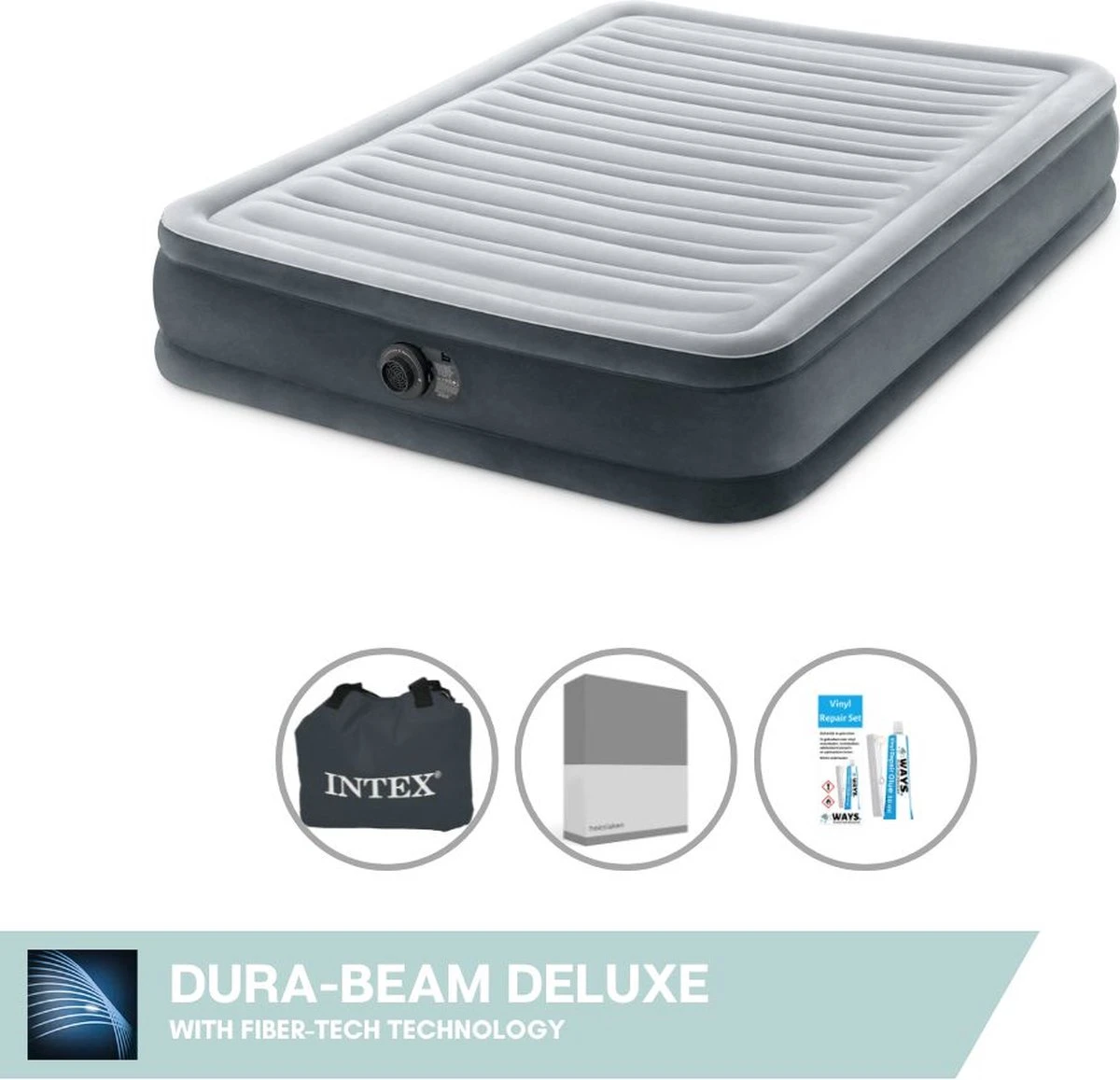 Deze luchtbedset bestaat uit een luchtbed (inclusief pomp), bijpassend hoeslaken en een handig reparatiesetje om eventuele lekken gemakkelijk te kunnen dichten