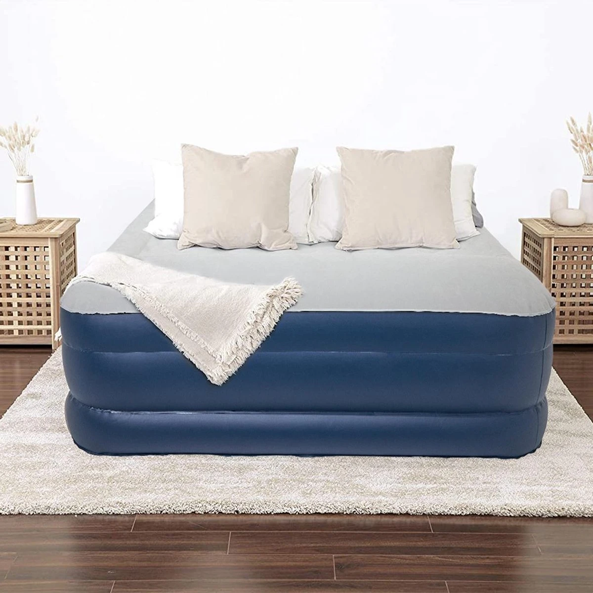 Altijd al een keer samen willen glampen of een lekker groot logeerbed willen hebben waar je een gat in de dag op kan slapen? Het tweepersoons LifeGoods airbed heeft 35 luchtspiralen die ervoor zorgen dat je altijd comfortabel ligt. Met de ingebouwde pomp blaas je het airbed in 3 minuten op. De 8 cm dikke bovenrand is ideaal als hoofdkussen. Het bed is 203,00 x 152,00 x 46,00 cm en kan 295 kg aan. Daarbij is het airbed niet alleen zacht en waterproof, maar ook slijtvast en lekbestendig! Mocht het airbed toch lek gaan, kan hem gemakkelijk repareren met de meegeleverde reparatiekit. Stop het airbed in de draagtas, neem het mee in de kofferbak en slaap altijd met ultiem comfort!