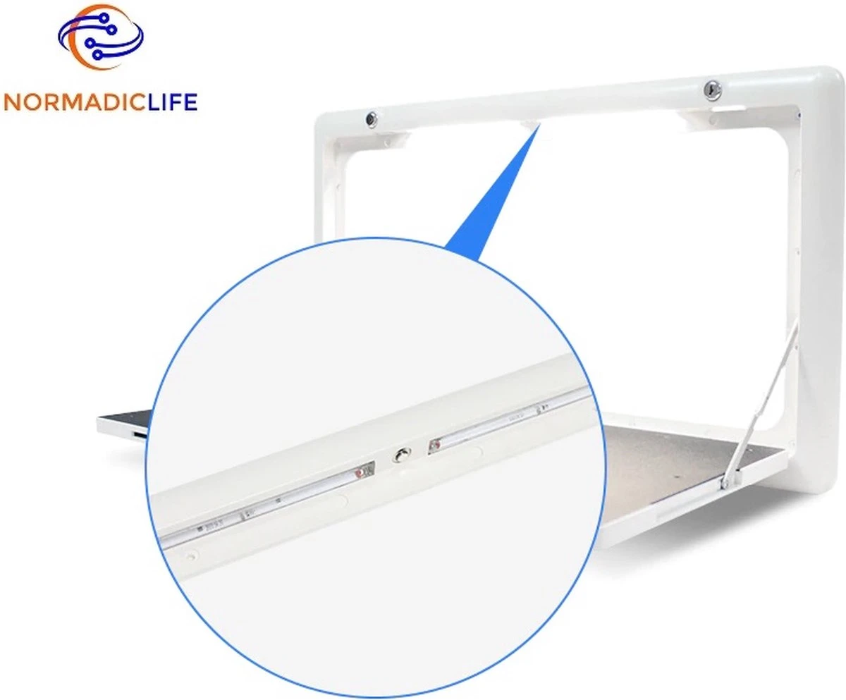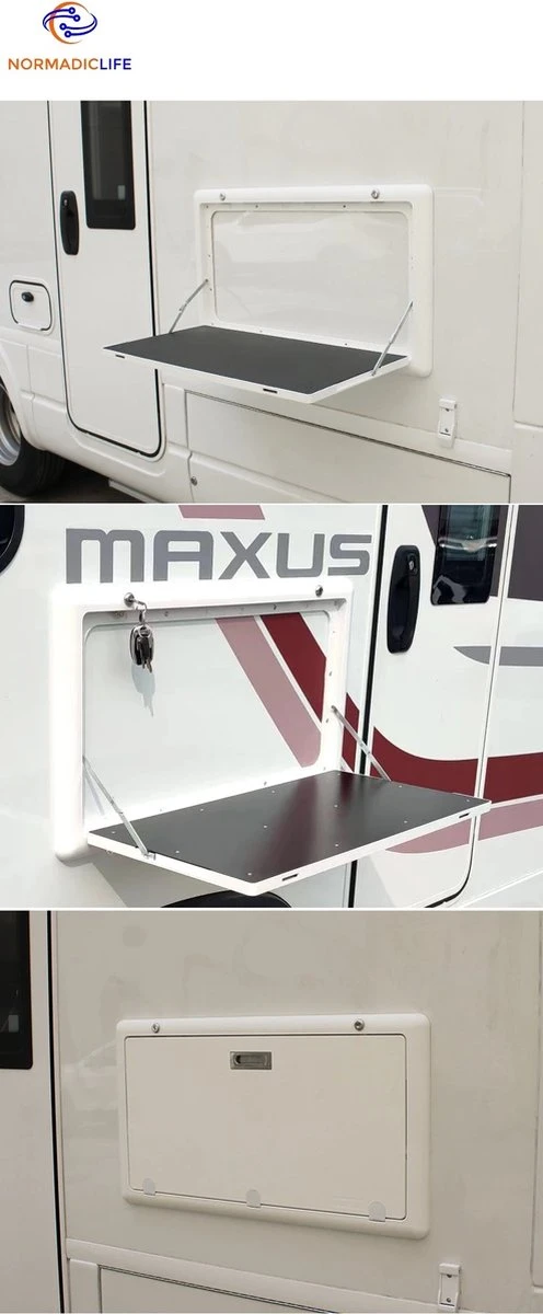 Deze praktische buiten tafel is eenvoudig te monteren aan uw caravan of camper-busje.