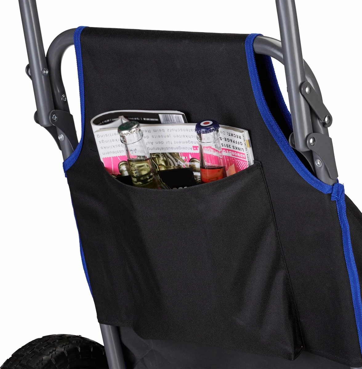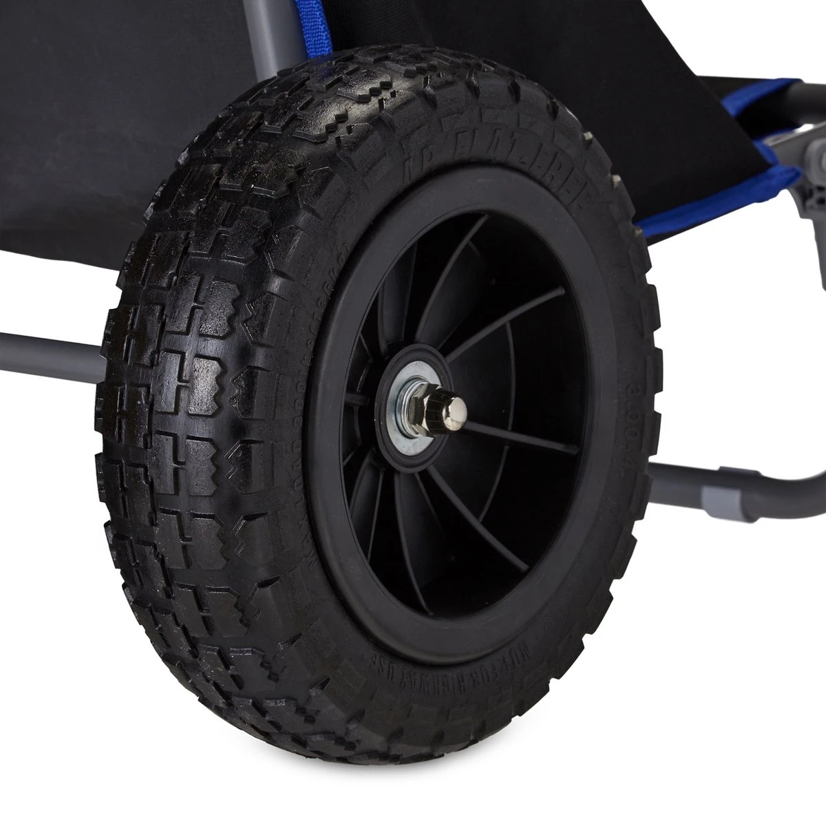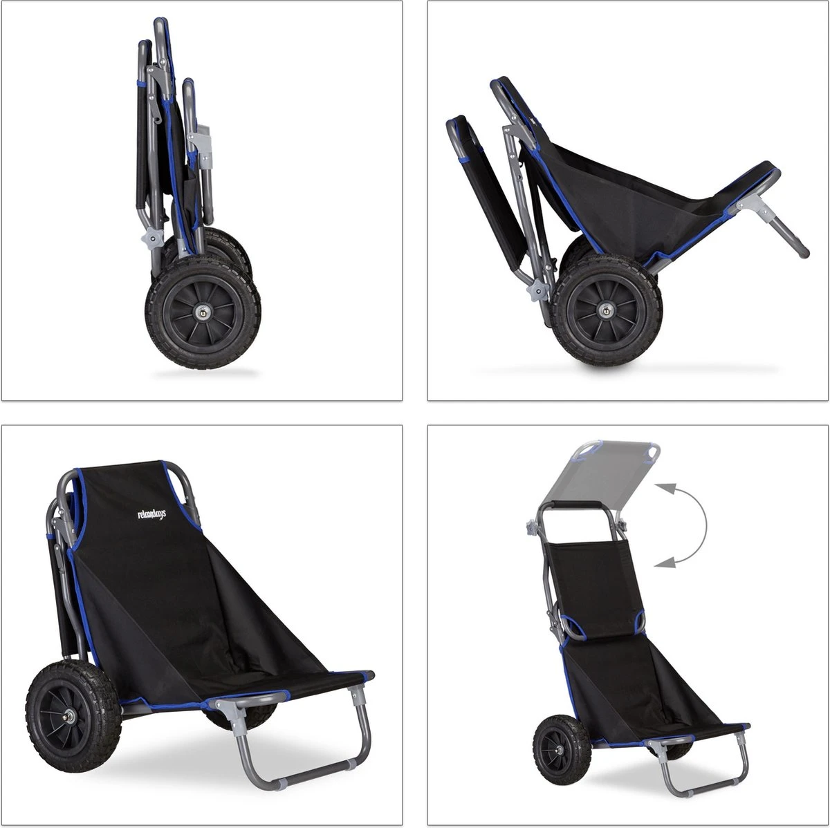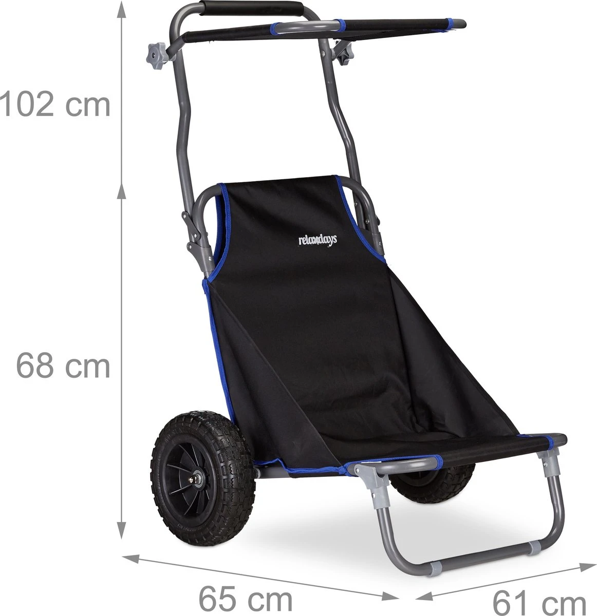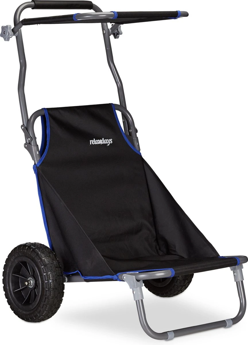 Voor de weg van het strand naar huis gebruik je de ligstoel als transportwagen. Hiervoor hoef je enkel de voorste steun omklappen. Met de gepolsterde handgrepen kun je nu de beach trolley comfortabel trekken en eenvoudig handdoeken, zwemkleding etc. vervoeren. Dankzij de brede wielen van rubber kun je gemakkelijk door het zand rijden. Doordat ze van rubber zijn, hoef je niet bang te zijn dat de banden leeg lopen.