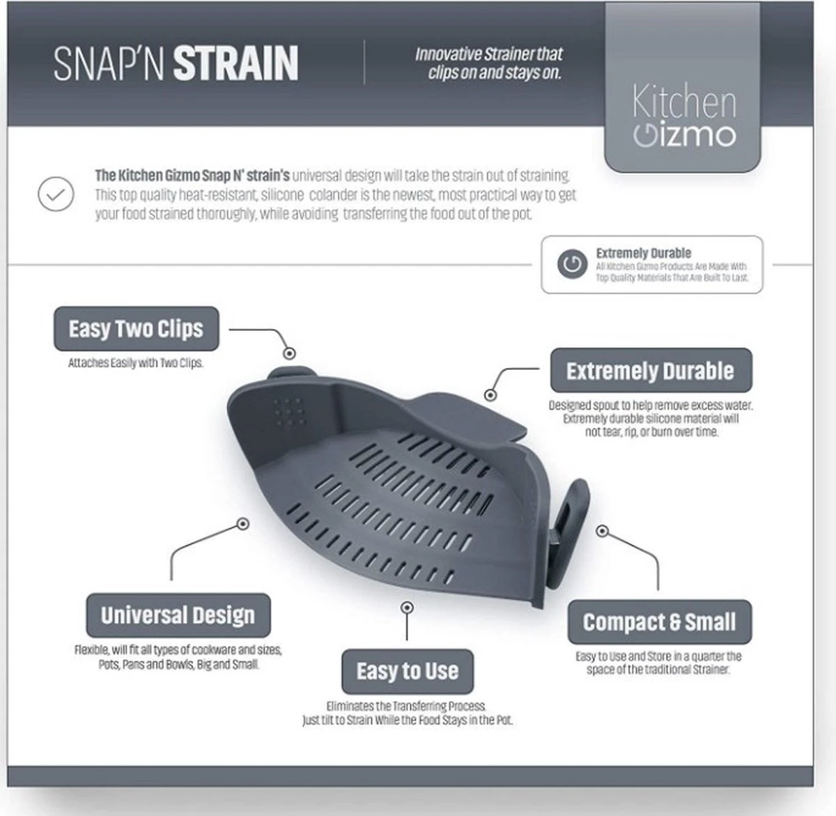 Een simpel, maar modern ontwerp met afgeronde hoeken, 2 clips en een gietmond waarlangs het meeste overtollige water weg kan voor drainage. Wat deze set uniek maakt is het gebruiksgemak en de compactheid, je hebt namelijk het gemak van een vergiet minus de opbergruimte die het inneemt.